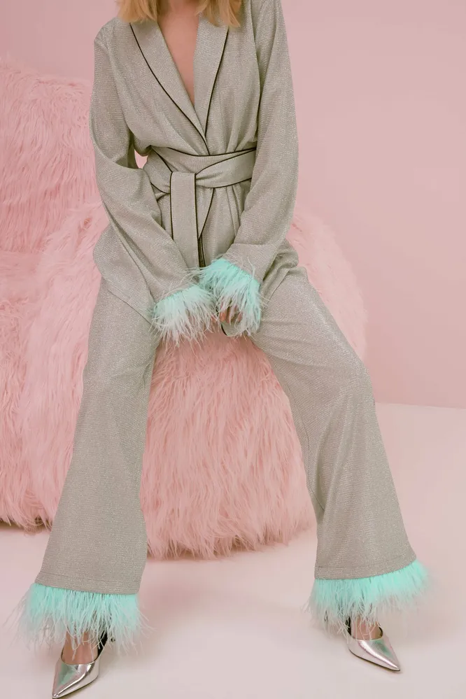 Эта пижама — идеальный вариант для романтического ужина дома (например, на 14 февраля) или для вечера в ресторане с продолжением. Ткань металлик в 2023 году — самый тренд и писк моды, а перья добавляют образу шика и в то же время ироничной расслабленности. Пижамный комплект с брюками доступен в двух цветах — серебристо-голубом и розовом.