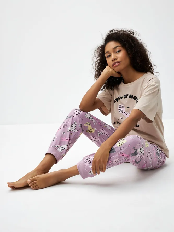 Что может быть уютнее для домашней одежды, чем принт с котиками? Трикотажная пижама из 100% хлопка скроена так, чтобы в ней было удобно спать, делать зарядку и даже работать из дома. Обратите внимание, что пижамные штаны с манжетами — это гарантирует, что они и во сне не будут задираться, а продолжат согревать ваши ноги.