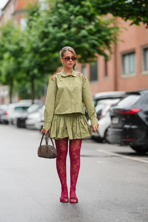 Не стоит забывать о текстуре. В этом сезоне колготки окончательно выходят из тени и становятся самостоятельным фэшн-акцентом. Дизайнеры играют с фактурами: кружево возвращается в романтичной и немного дерзкой интерпретации — черные ажурные узоры эффектно контрастируют с кожей и добавляют образу тонкую чувственность. На пике — и колготки в горошек: от едва заметных точек до крупных ретро-рисунков. Популярны также фактурные модели с геометрическими рельефами, полосками и имитацией вышивки. Каждая пара как высказывание: про иронию, провокацию или тонкую женственность.