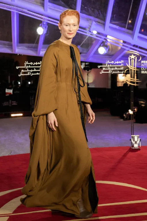 Тильда редко выбирает одежду по фигуре и даже на светское мероприятие в Марракеше облачается в платье, которое отсылает нас к нарядам муз прерафаэлитов. Присмотритесь к такому варианту, если вы хотите быть самой заметной в новогоднюю ночь.