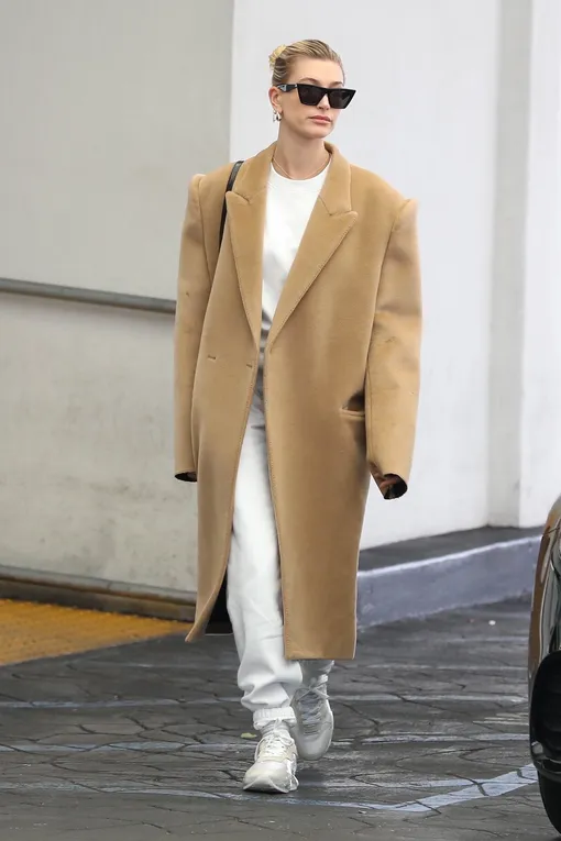 Возлюбленная Джастина Бибера не наденет вещь, если та не будет отличаться оригинальностью. Ее фаворитом на зиму стало плечистое бежевое пальто мужского кроя. Присмирить его внушительный объем помогает база, а именно белоснежный лонгслив, слаксы и кроссовки на массивной подошве. Несмотря на то, что уровень спортшика в комплекте зашкаливает, Хейли все равно выглядит очень соблазнительно.