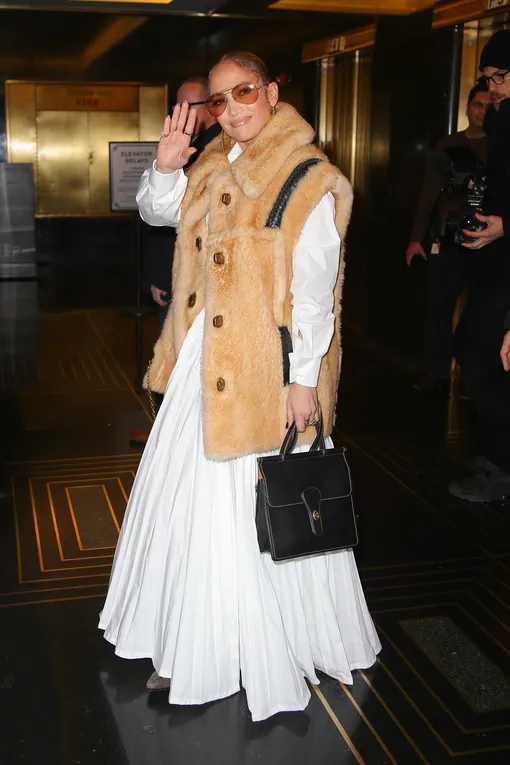 За последнее время Дженнифер Лопес завоевала славу королевы модных экспериментов. Ей без усилий удается подружить самые противоречивые вещи и при этом выглядеть на пять с плюсом. Недавно она облачилась в белоснежное чайное платье (достаточно объемное из-за нижней юбки) и вместо того, чтобы дополнить его жакетом-спенсером, как это делали модницы XIX-го века, набросила сверху меховой жилет-оверсайз. Образ получился эклектичным и одновременно женственным за счет использования элегантных аксессуаров — сумки-трапеции и авиаторов.