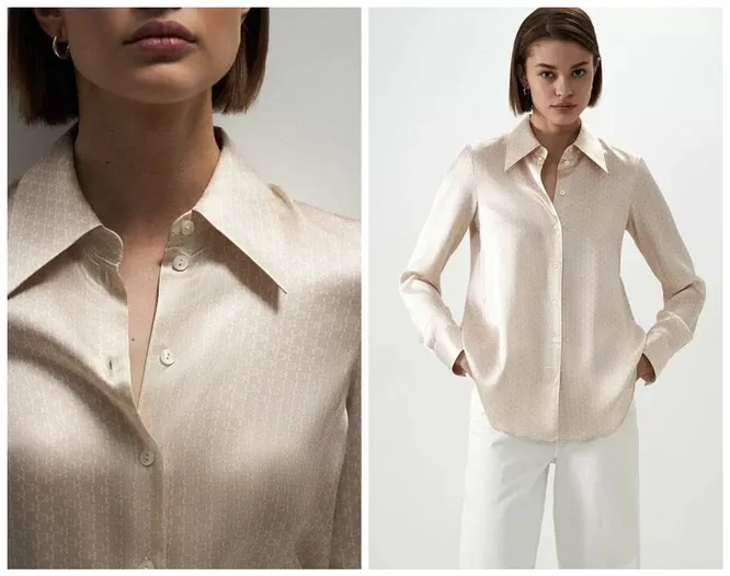 В этой блузе есть только намёк на главный цвет года, но она настолько нежная и красивая, что мы просто не смогли пройти мимо неё. Это 100% шёлк, по всей поверхности деликатно украшенный паттерном с логотипом бренда. Блуза может дополнить элегантный вечерний выход, но также будет уместна и в романтическом образе, и как часть наряда для неофициального делового ужина.
