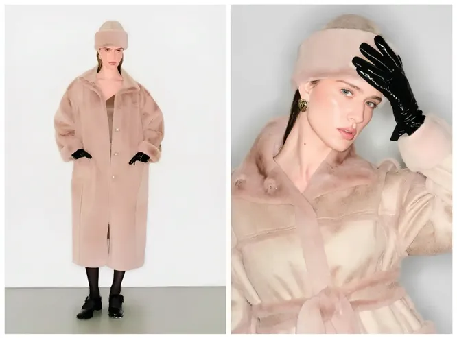 Название модели говорит само за себя: PEACHY — нежный персик, невесомый и очень уютный, ведь шуба выполнена из натурального овечьего меха, а, значит, в ней не будет холодно и при -20 градусах. Крой актуальный, двубортный, зауженный к низу и дополненный карманами с клапанами. Сейчас шубу можно купить по акции за половину цены.