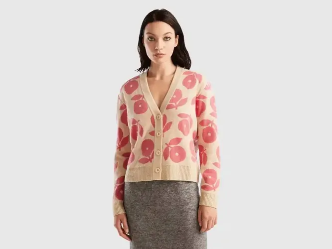 Ещё одну интересную вещь мы нашли в коллекции итальянского бренда United Colors of Benetton. Персиковая гамма здесь неочевидна, но сочетание мягкой бежевой основы и тёмно-розового рисунка дают тот самый эффект «пушка», о котором сейчас все говорят. Красивый и актуальный кардиган, который прослужит вам не один сезон.