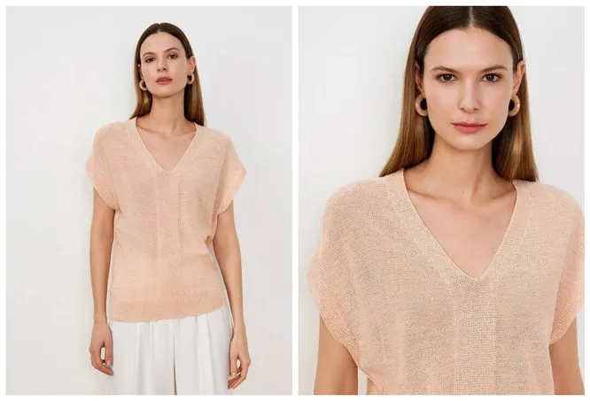 Интересная модель от российского бренда Elis со стопроцентным попаданием в цвет 2024 года — вязаная блуза из рельефной хлопковой пряжи с V-образной горловиной и поясом-резинкой. Это универсальный вариант, сочетающийся как с юбками макси и миди, так и с широкими брюками. Блуза также может стать новогоднего комплекта — особенно, если подобрать низ в тон и разбавить монохром крупными серьгами. Сейчас модель можно купить по сниженной цене.