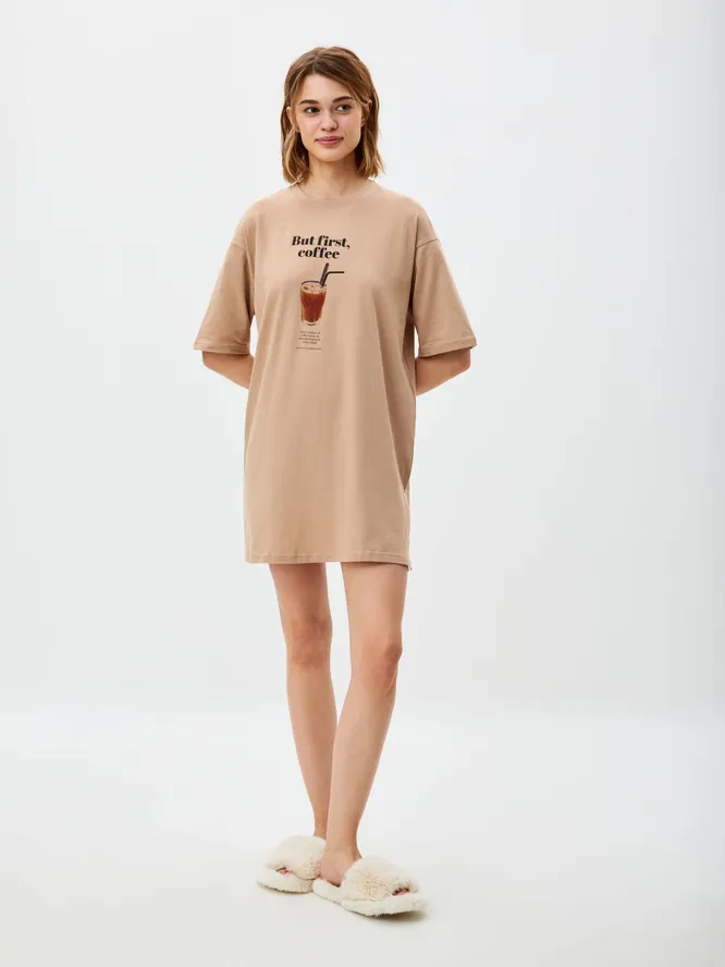 Нежная хлопковая сорочка прямого кроя из домашней коллекции российского семейного бренда SELA. Такую приятно получить в подарок и носить самому, ведь цвет, приближенный к персиковому, успокаивает и настраивает на крепкий сон. Забавная деталь в виде принта и надписи «Но сначала кофе» — для того, чтобы взглянуть утром на себя в зеркало и начать день с позитива.