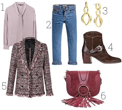 1 — Блуза, Luisa Cerano; 2 — Джинсы, Levi’s; 3 — Серьги, SUNLIGHT; 4 — Казаки, Geox; 5 - Жакет, Laurel; 6 — Сумка, See by Chloe, Rendez-Vous