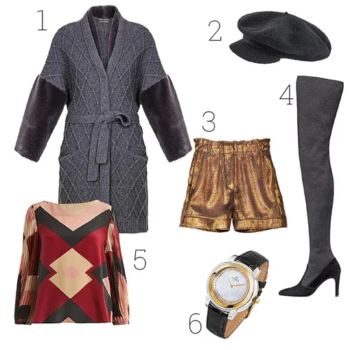 1 — Кардиган, Marina Rinaldi; 2 — Кепи, Marc Cain; 3 — Шорты, Nude; 4 — Ботфорты, Tamaris; 5 — Блуза, Marella; 6 — Часы, «Ника»