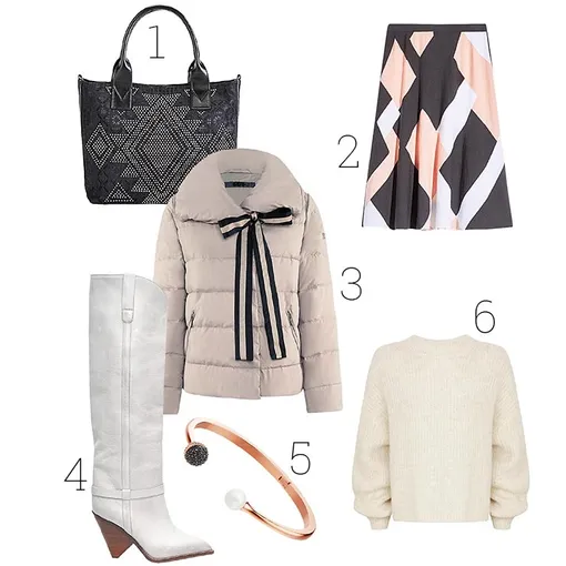 1 — Сумка, Pinko; 2 - Юбка, MAX&Co; 3 — Пуховик, AIRFIELD; 4 — Сапоги-казаки, Isabel Marant Rendez-Vous; 5 — Браслет, Swarovski; 6 — Джемпер, Marks & Spencer