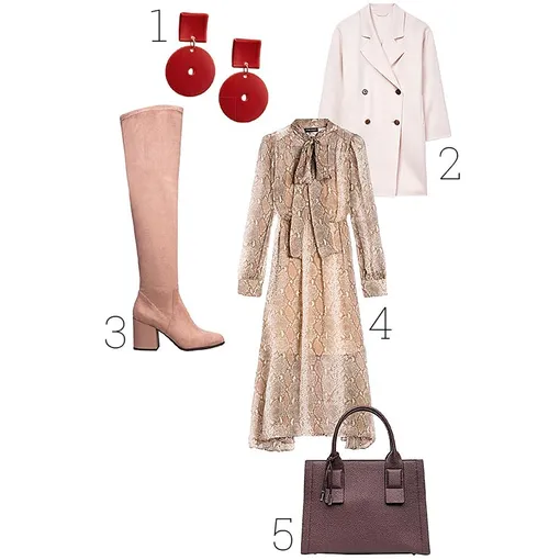 1 — Серьги, Mango; 2 - Пальто, Luisa Cerano; 3 - Ботфорты, Ekonika; 4 - Платье, TWINSET; 5 — Сумка, Eleganzza
