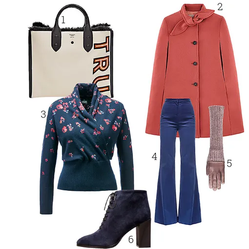 1. Сумка, Trussardi; 2. Кейп, Paul & Joe Sister; 3. Джемпер, Madeleine; 4. Брюки-клеш, Pinko; 5. Перчатки, Eleganzza; 6. Ботильоны, Ekonika