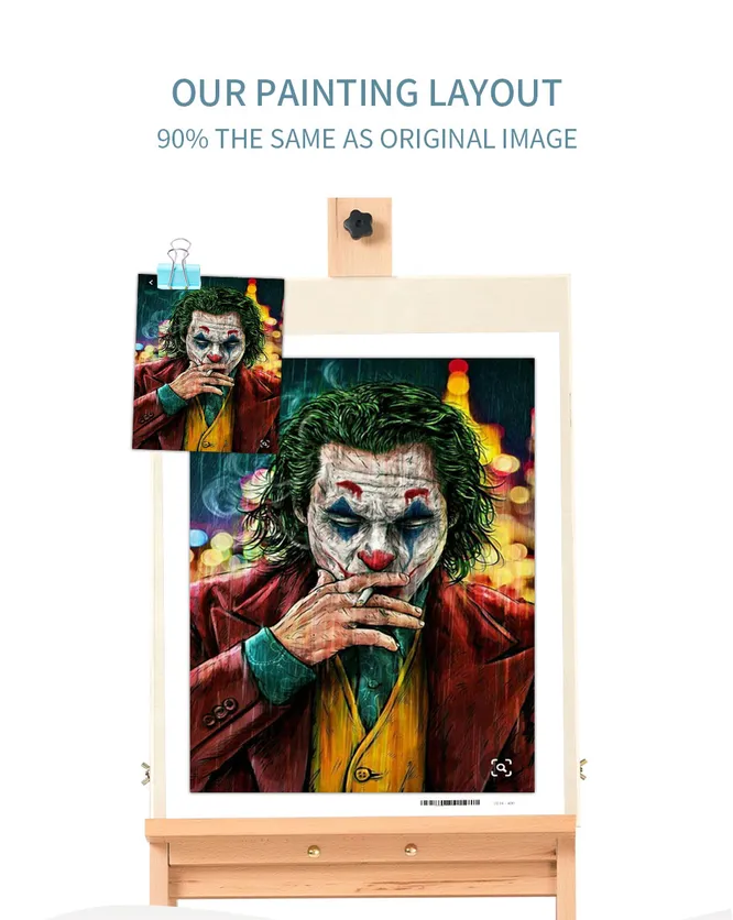 Еще одна популярная история среди любителей рисовать по номерам — герои и сюжеты из фильмов. Как насчёт того, чтобы нарисовать Джокера? Кстати, часто можно выбрать одну и ту же картину в разных размерах: носить в сумке или повесить на стену — решаете только вы.