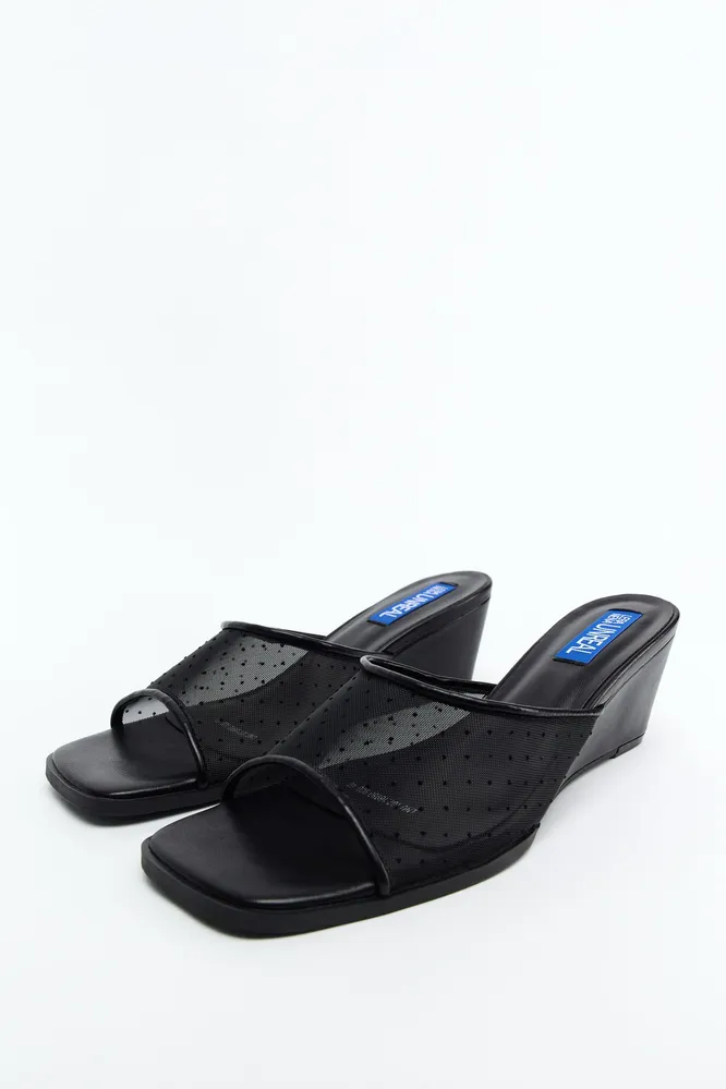 Босоножки влюбляют в себя с первого взгляда! Их особенность — верх-сеточка в маленький горошек. Кстати, такой принт — тоже тренд, как и прозрачные детали.