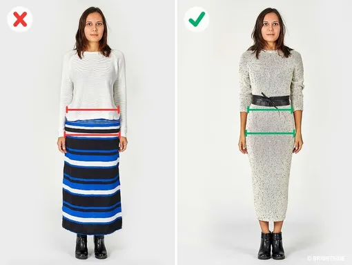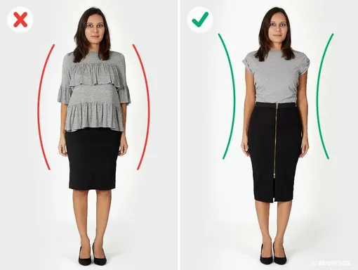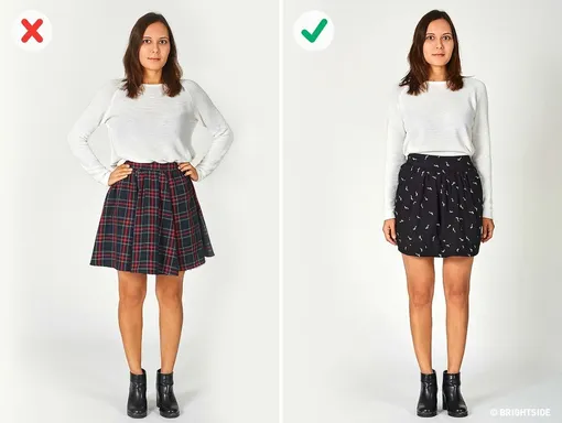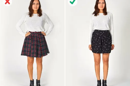 Зрительно размывают фигуру, делая ее шире и бесформеннее. Вспомните, для чего был изобретен камуфляж у военных? Чтобы «растащить» очертания фигуры и сделать ее пятном. Выбирайте однотонные вещи, на которых швы и элементы декора вытянуты снизу вверх.