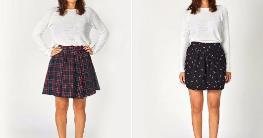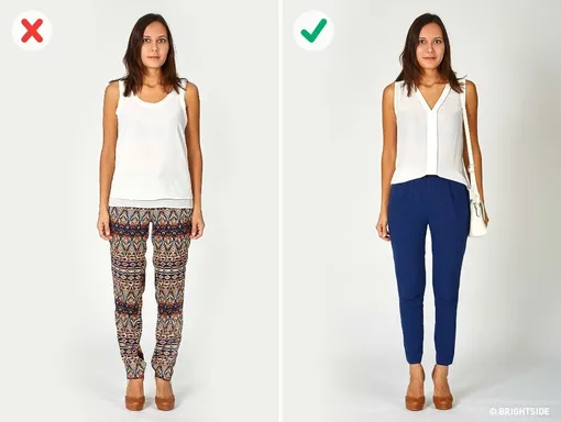 Единственное различие в этих двух фото — яркость рисунка. Да, бледное стройнит. Ну, хорошо, хорошо, в брюках наша модель выглядит гораздо лучше, чем в юбке. Вы тоже заметили?