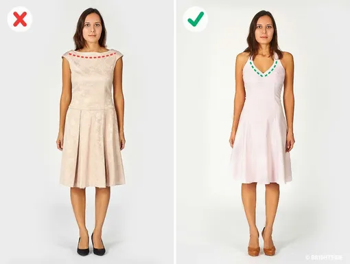 V-образное декольте всегда выигрышнее. Помните, мы говорили о складках? Посмотрите на фото слева, насколько они портят линию талии.