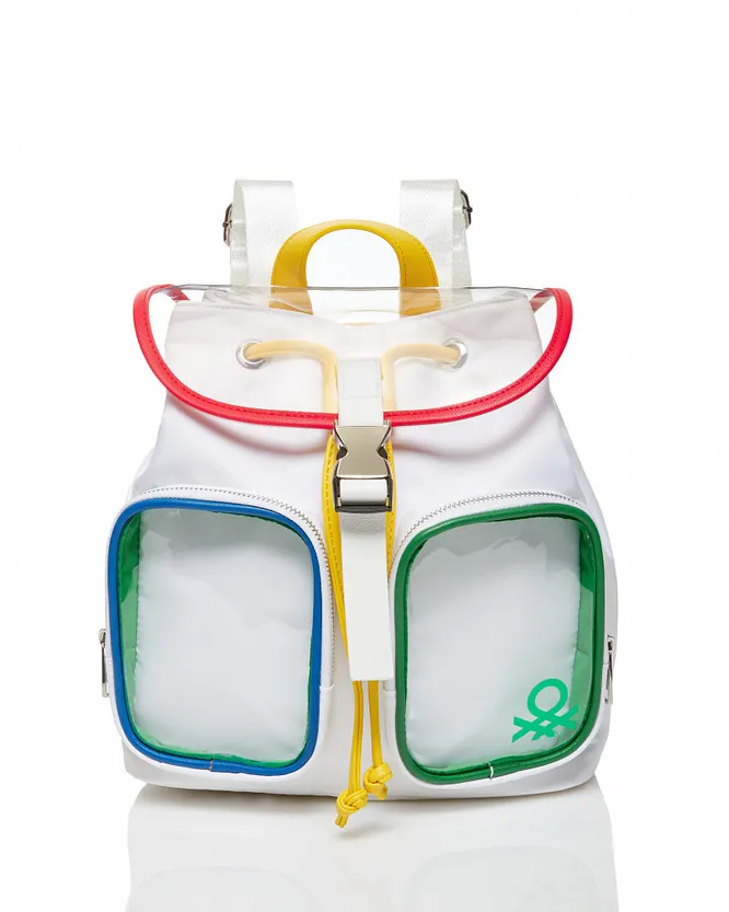 Белый рюкзак с характерными «беннетоновскими» яркими деталями и прозрачными окошечками карманов подойдет к разноцветному летнему кэжуалу – джинсам, плиссированным юбкам, пуловерам, футлолкам и кроссовкам. Впрочем, ваш стиль – ваши фантазии! А рюкзак отличный.
