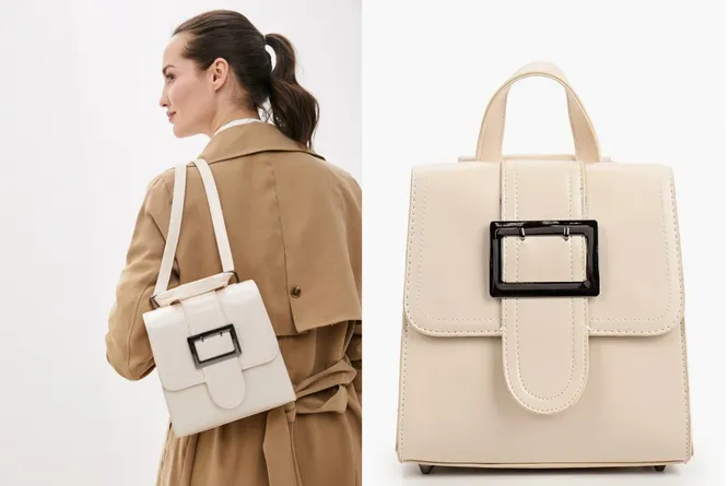 Миниформатный рюкзак с ручками и большой эффектной пряжкой можно носить не только как удобный рюкзачок, но и как сумочку к платью. Допустим, после работы у вас свидание, выход в кино, встреча одноклассников в общем, «туда тоже можно».