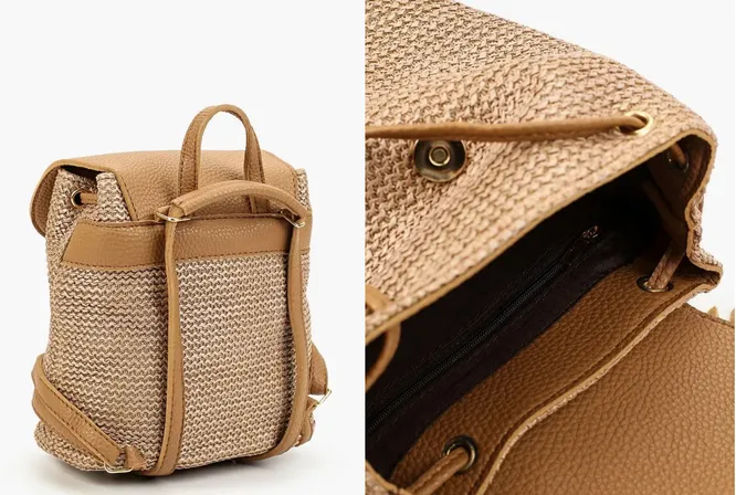 Рюкзак в стиле Бохо – из искусственной кожи и плетеного текстиля. Идеально подойдет к платью в мелкий цветочек в стиле «девушки ковбоя» или к легкому песочному костюму а-ля сафари. Можно дополнить шляпой и ботинками на шнурках (хотя сойдут и сандалии).