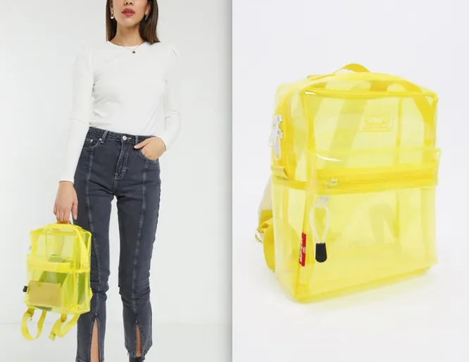 Прозрачный желтый рюкзак для тех, кто не боится быть ярким. Смотрите, как он преображает простой, в общем-то, образ девушки – скромный белый топ, темные джинсы. Добавляем рюкзак, красную помаду, и хоп – совсем другое настроение! Правда, придется следить за тем, чтобы вещи внутри всегда были немножечко «для других». Мятую салфетку или запасной бюстгальтер уже не положишь. Соблюдаем фасон!