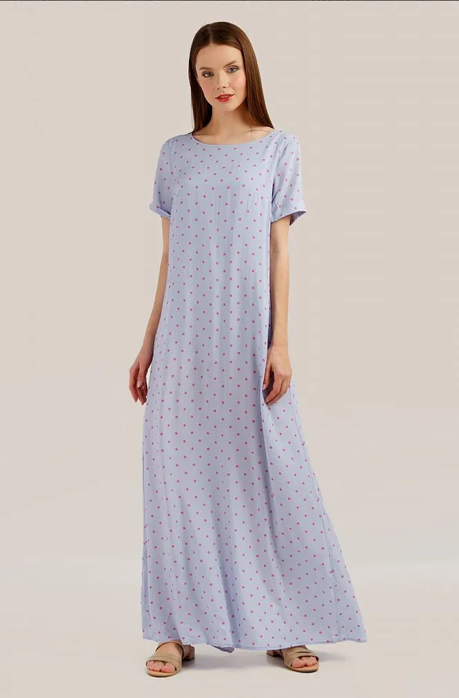 Такие платья еще называют платье-футболка: за счет максимально простого кроя. Однако эта модель очень длинная и расширяется книзу, поэтому выглядит очень женственно. Летящая, ниспадающая ткань подарит образу легкости. Носите его днем на работу, а вечером, дополнив длинным колье или крупными серьгами и клатчем – в театр. Конечно, после того, как карантин закончится.
