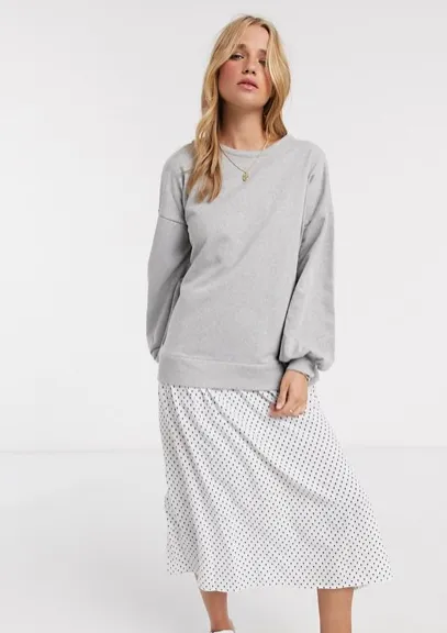 На самом деле это не юбка и свитшот, а платье: единая конструкция. Суперидея для тех, кто вечно спешит: выбирать верх к низу и низ к верху не придется. Не только удобно, но и женственно: юбка легкая и летящая.