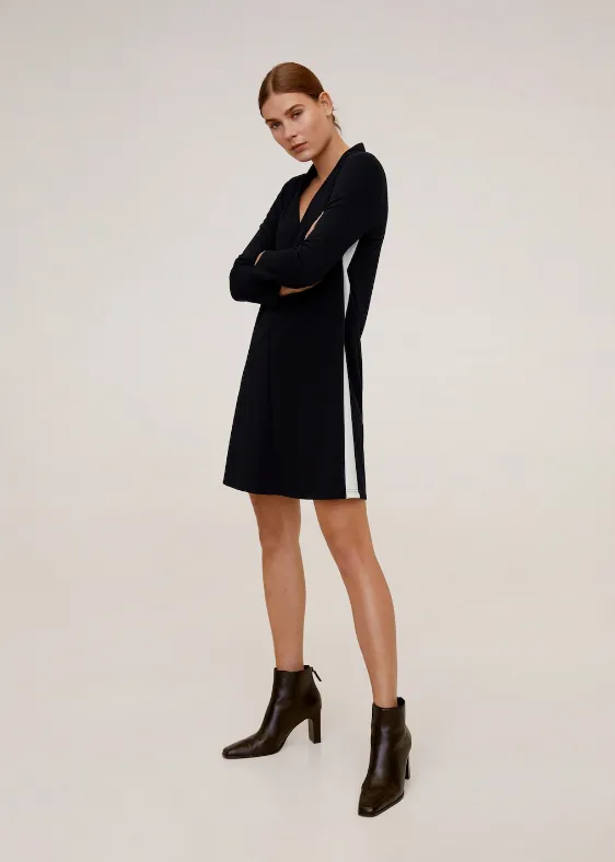Помните выражение Коко Шанель, о том, что в гардеробе каждой девушки, должно быть маленькое черное платье? Так вот, если его у вас еще нет, то можно смело брать это. Слегка расклешенное с простыми белыми полосками, оно в меру дерзкое, в меру деловое. Вы будете носить его долгие годы: черный цвет – это всегда модно.