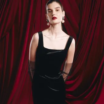Бархатное платье подчеркивает торжественность момента, красиво играет в свете театральных люстр и создает роскошное камерное настроение.
