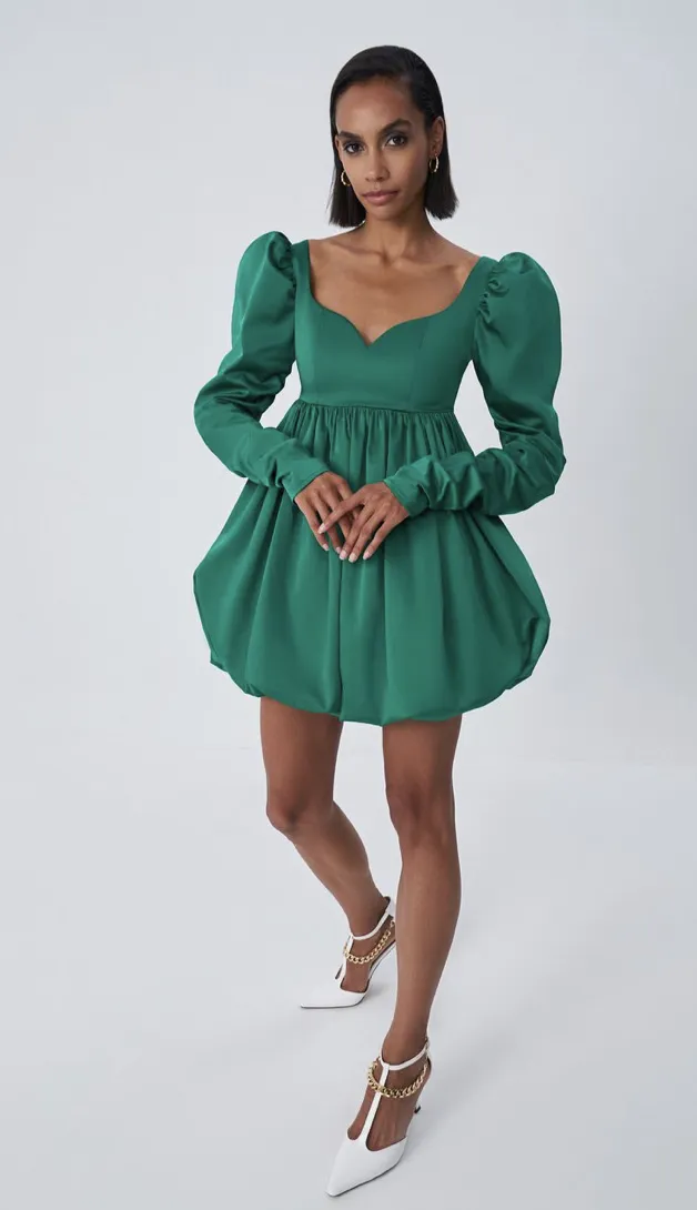 Зелёный цвет прочно укрепился в списке трендов. Короткое платье с пышной юбкой и рукавами-фонариками смотрится весьма кокетливо. Наряд выполнен из хлопка, поэтому в нём будет комфортно в любом помещении. С этим платьем можно сочетать обувь на каблуке, а в качестве аксессуара выбрать небольшой клатч.