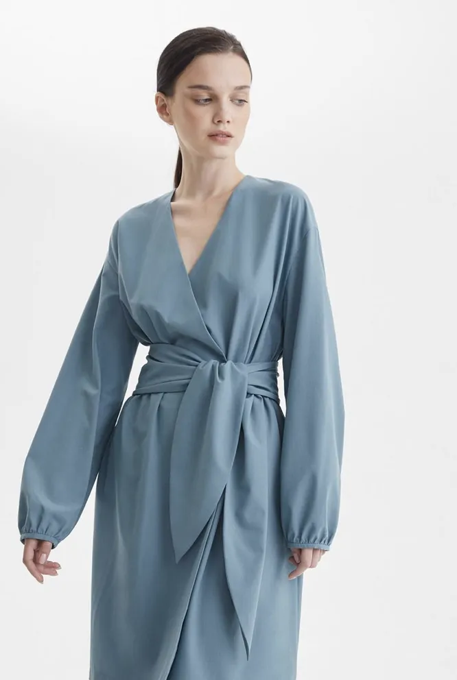 Большой плюс этого голубого платья — акцентный пояс. Такая модель подойдёт на любую фигуру. Длина по колено и V-вырез подчеркнут ваши достоинства. Чтобы образ стал более интересным, на шею стоит добавить романтическую подвеску.
