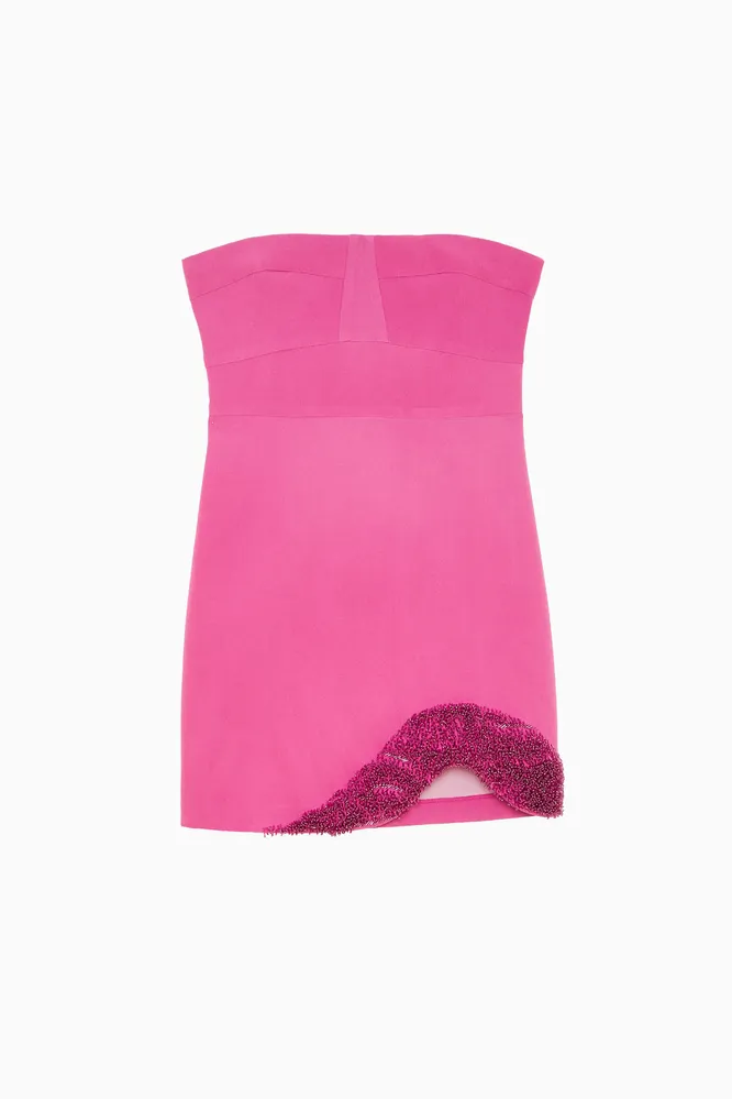 Если вы планируете провести 14 февраля в ночном клубе, но короткое платье розового цвета с вышивкой по низу, изготовленной вручную, беспроигрышный вариант. Наряд-бандо подойдёт смелым девушкам с небольшой грудью, так как под него трудно будет подобрать незаметный бюстгальтер. Платье будет идеально смотреться с обувью на платформе и каблуке, похожей на знаменитые туфли Versace Bratz.