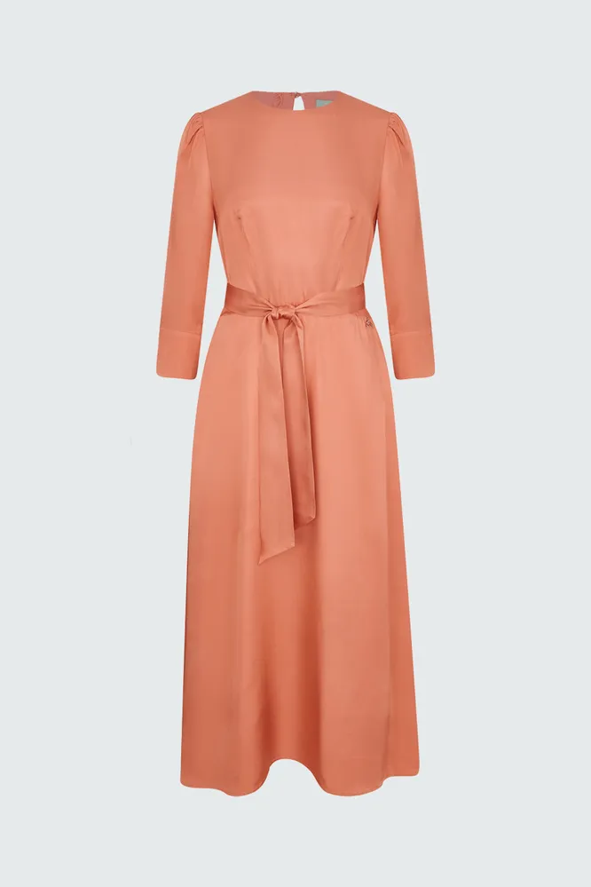 Платье персикового цвета с поясом на талии поможет создать вам лёгкий и непринуждённый образ. Наряд уместен для свидания в любом месте, так как смотрится сдержанно и элегантно. Поскольку рукава немного укороченные, можно дополнить образ браслетами. В качестве обуви лучше выбрать бежевые туфли.