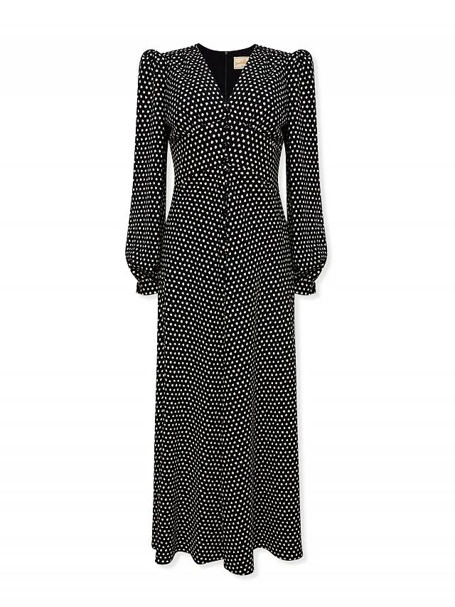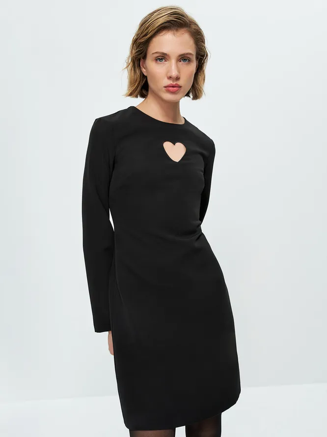 Российский бренд выпустил лимитированную коллекцию вместе с актрисой Любовью Аксёновой специально к 14 февраля. На некоторых вещах можно увидеть вырез в форме сердца. Платье чёрного цвета выше колена достаточно универсально. Например, днём в нём можно пойти на работу, а вечером — на свидание. Лучше всего наряд будет смотреться с ботфортами выше колена. Чтобы образ не казался скучным, сделайте яркий макияж вечером.
