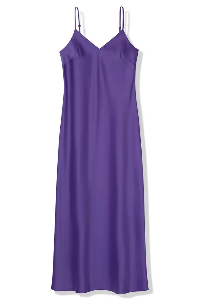 Фиолетовое платье миди-длины подойдёт как для вечера с любимым человеком в домашней обстановке, так и для похода в кафе. Бренд славится своими невысокими ценами, поэтому к этому наряду можно будет подобрать ещё и верхний слой, при этом не очень потратившись. Платье-комбинацию стоит сочетать с укороченными пиджаками или кардиганами. На ноги можно подобрать как ботинки на грубой подошве, так и изящные ботильоны.