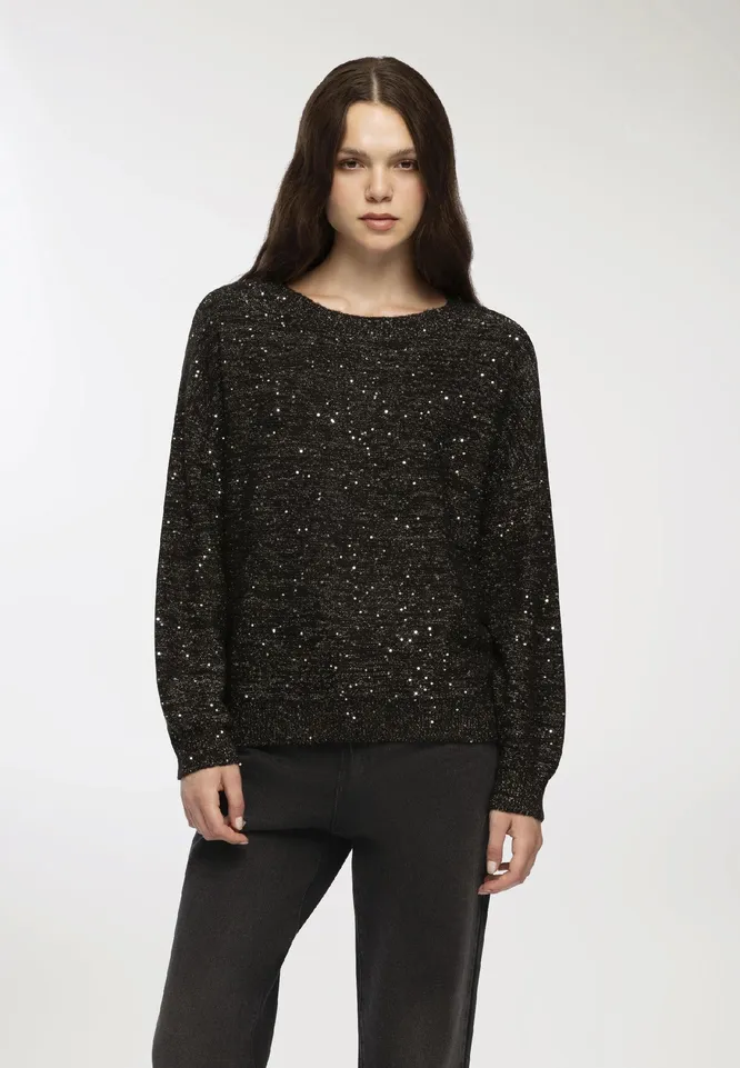 Если хочется настоящего сияния, но платье — не ваш сценарий, выберите свитер с декором. Пайетки, вышивка или рассыпь страз на плечах и рукавах превращают уютную вещь в модный вечерний элемент.