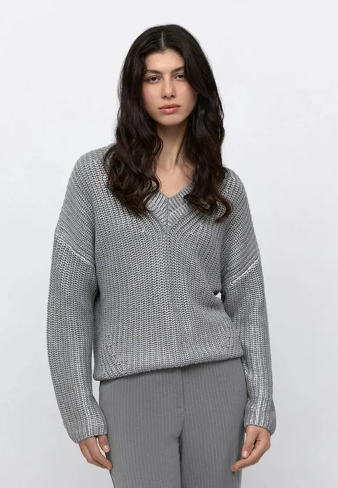 Если в душе все же хочется блеска, обратите внимание на свитеры из пряжи с металлическим эффектом. Серебристый, бронзовый или золотистый люрекс красиво играет на свету и напоминает мерцание гирлянд.