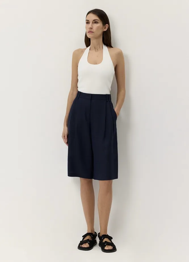 Черные бермуды обязательно должны быть в гардеробе. Это некий вид официальных шорт, которыми можно заменить брюки в жару. Правильная длина, высокая посадка и свободный крой — это то, что позволяет надевать укороченные бермуды в офис или на деловую встречу в жару.