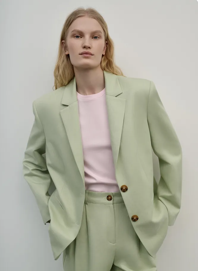 Цвет, который влюбляет в себя с первого взгляда. Фисташковый жакет смотрится невероятно нежно и хорошо освежает летний оьраз. Модель оверсайз позволяет носить его с джинсами или мини-юбками. Однако вы можете приобрести полный комплект (пиджак+брюки), чтобы иметь в гардеробе готовый образ для деловой встречи, свидания или похода в ресторан.