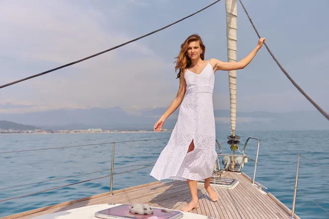 Белое льняное платье на тонких бретельках — это настоящая курортная классика. Голубое небо, голубое море, мраморные колонны старинных особняков, белый известняк приморских домишек — и на этом фоне великолепная вы. Лиф платья посажен по фигуре, а ткань с прорезным шитьем спасает от жары. Фасон юбки — самый тренд 2023: широкий волан и глубокий разрез в длинной юбке. Даже в жаркой загазованной столице вы будете в этом платье словно глоток соленого морского ветра.
