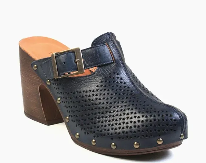 Сабо (или клоги) — это туфли на деревянной подошве с массивным каблуком. В момент своего рождения, сабо изготавливались полностью из дерева (вспомните голландские и французские деревянные башмачки), а клоги как раз были с кожаным верхом. Сегодня никто не использует полностью деревянную обувь, а вот с кожей можно встретить нередко. Главной отличительной чертой сабо является цельная подошва, где каблук и платформа – единое целое. Чаще всего у таких туфель открытая пятка, именно поэтому мюли, о которых написано выше, называют сабо, но это ошибка. А вот носочная часть вполне может быть как открытой, так и закрытой. Место соединения кожи и подошвы часто декорируют металлическими заклепками.