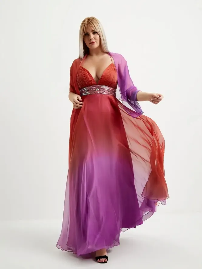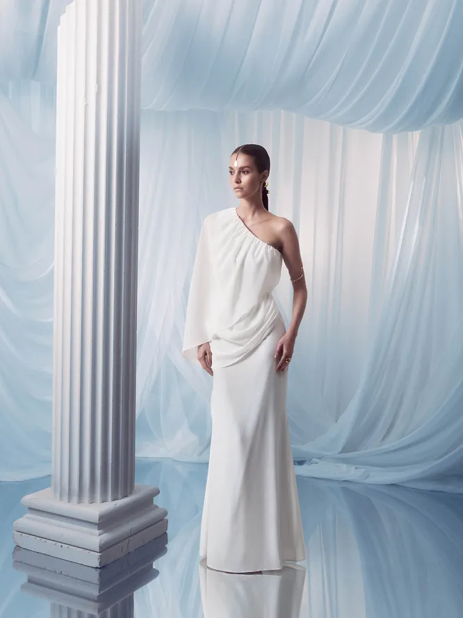 Есть что-то невероятное в чарующем сочетании фиолетовых и розовых оттенков. Платье с лифом-халтер и эффектной драпировкой на юбке, дополненное золотой тиарой в виде лаврового венка, — прямой отсыл к силуэтам древнегреческих хитонов. Чем не сирена?