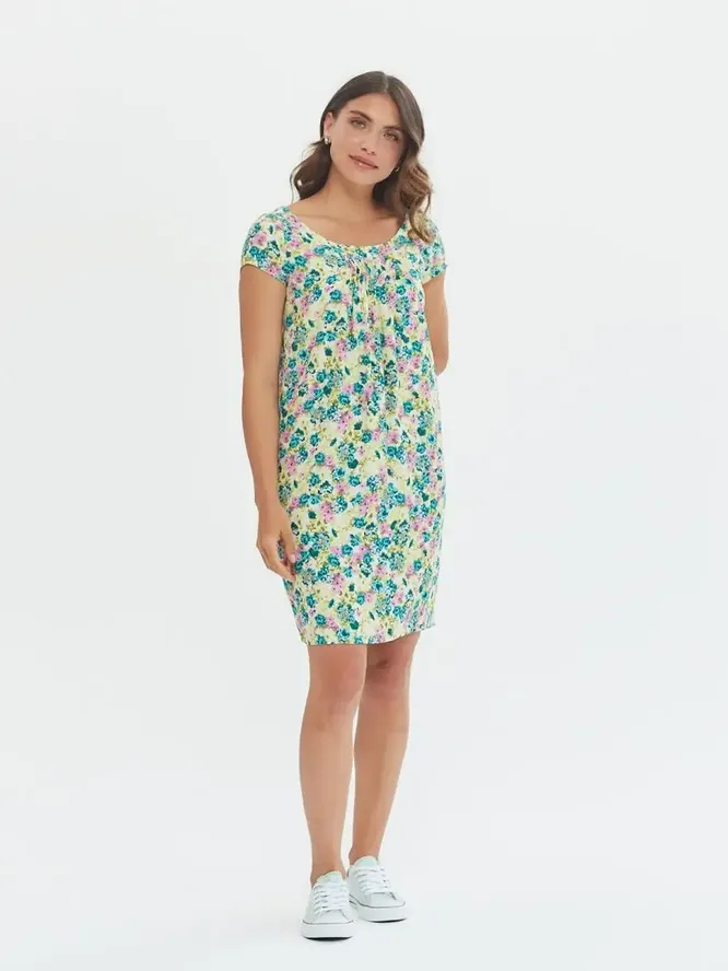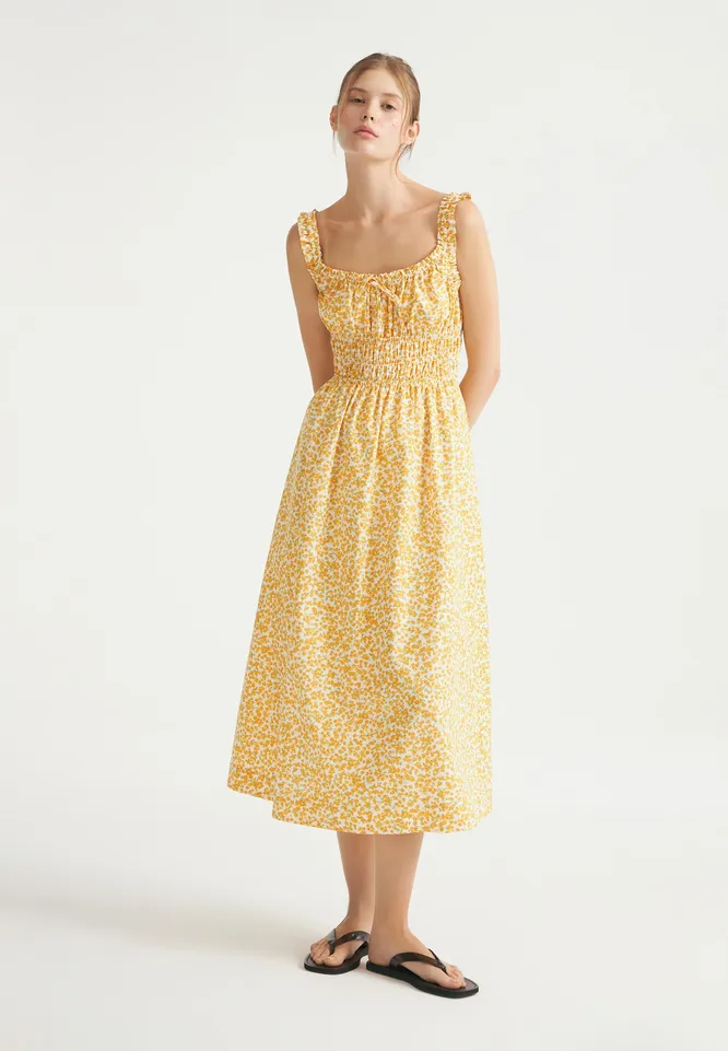 Выбирайте платья и сарафаны из натуральных тканей свободного, лишь слегка приталенного силуэта. Палитра солнечная — от модного сливочного оттенка до ярко выраженной охры.