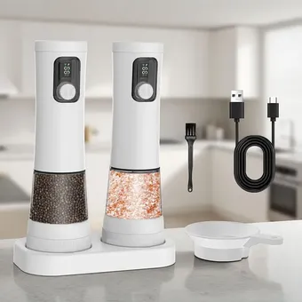 Набор из двух электрических мельниц для перца и соли, емкостью 100 мл каждая. Футуристичный дизайн, LED экраны, зарядка через USB кабель. Возможность выбрать один из пяти уровней помола позволяет получить крупные частицы или тонкую пудру. Корпус мельницы удобно ложится в ладонь, подсветка при дозировании специй исключает риск пересола. В комплект входит воронка для аккуратного заполнения емкостей и кисточка для их очистки.