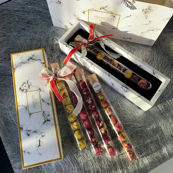 Любители экзотического чаепития высоко оценят подарочный набор китайского цветочного чая. Лонг Джу Хуа Ча — элитный чай ассорти в колбе из провинции Футьен. Набор в изящной упаковке дает возможность попробовать 7 сортов: роза (Мэй Гуэй), османтус (Гуэй Хуа), жасмин (Мо Ли), императорская хризантема (Хуанг Тю, белая хризантема (Бай Тю), лилия (Бай Хы) и ягода годжи (Гоу Тьси).