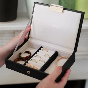 Элегантная шкатулка из мягкой экокожи с бархатной подложкой для ювелирных изделий и бижутерии. Компактно размещается на туалетном столике и защищает украшения в дороге. Классическое оформление шкатулки делает ее вневременным стильным аксессуаром.