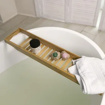 Удобная легкая полочка, которая плотно ложится на бортики ванны и не сползает в сторону. На ней можно установить книгу, телефон или планшет, бокал и свечу, чтобы насладиться пенной ванной с ароматическими солями. В другое время на столике-полке удобно разместятся принадлежности для душа, игрушки, мочалки и губки.