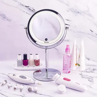 Двустороннее зеркало с плавной сенсорной регулировкой подсветки. Снабжено 18 светодиодами, которые питаются от аккумулятора и автоматически отключаются через 15 минут. Одна из поверхностей зеркала обеспечивает семикратное увеличение, вторая — обычная. Гаджет позволяет рассмотреть любые подробности и помогает аккуратно нанести самые мелкие штрихи макияжа.