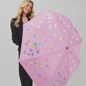 Красивый и компактный зонт-полуавтомат от российского бренда Flioraj с тройным сложением. Белые бабочки на голубом, розовом или черном фоне при попадании на них влаги становятся разноцветными. Купол диаметром 116 сантиметров с пропиткой, с которой «скатываются» вода и грязь. Система «антиветер» и усиленный каркас защищают зонт от поломки при порывах ветра.