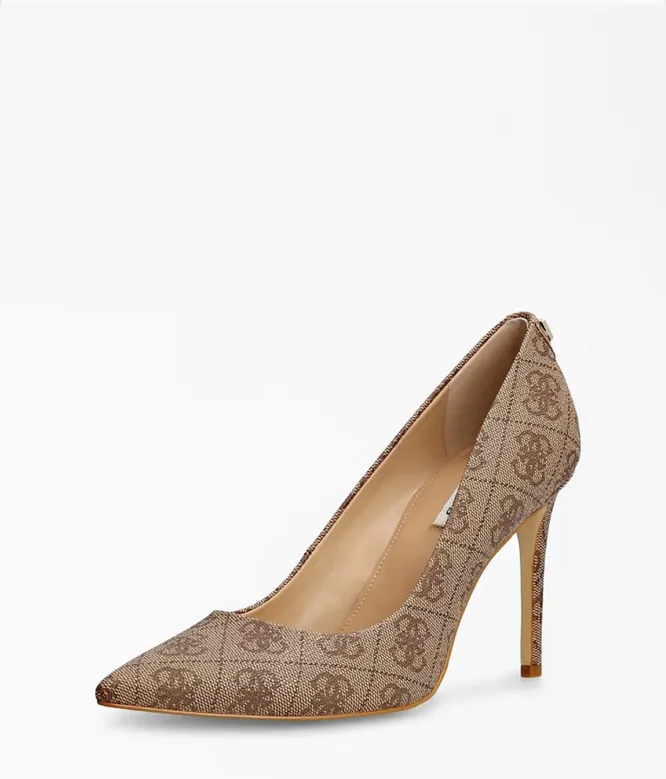 Есть среди нас фанаты логомании? Эти бежевые классические лодочки на шпильке выделяет среди остальных стильный принт из маленьких логотипов. Кстати, такая модель беспроблемно впишется практически в любой образ: и в праздничный с коктейльным платьем, и в повседневный с синими джинсами и блузкой.